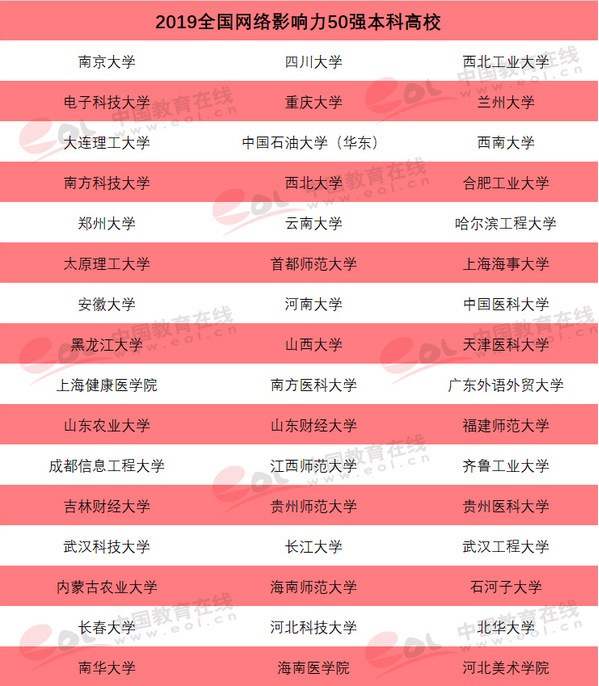 本次评选共包含“全国网络影响力50强高校”“全国网络搜索热度50强高校”以及各省(市/自治区)“就业竞争力高校”“网络口碑高校”“高中生关注高校”“中学信赖高校”等子榜单,其中 香蕉app,“全国网络影响力50强高校”榜单是基于中国教育在线舆情系统采集的全网超过900万以上信息源教育数据,对其中各个高校在全网发布的各类信息,如学校简介,办学成果,招生简章,专业设置,录取分数,就业质量,校园风景,草莓视频污污污,师资力量等招生宣传信息,以及高校在权威主流媒体报道的高校新闻资讯的传播数据分类筛选后,进行加权计算,并综合家长,考生问卷调查,高等教育领域同行评价数据,最终评选出以网络影响力为最佳的全国50所本科高校。