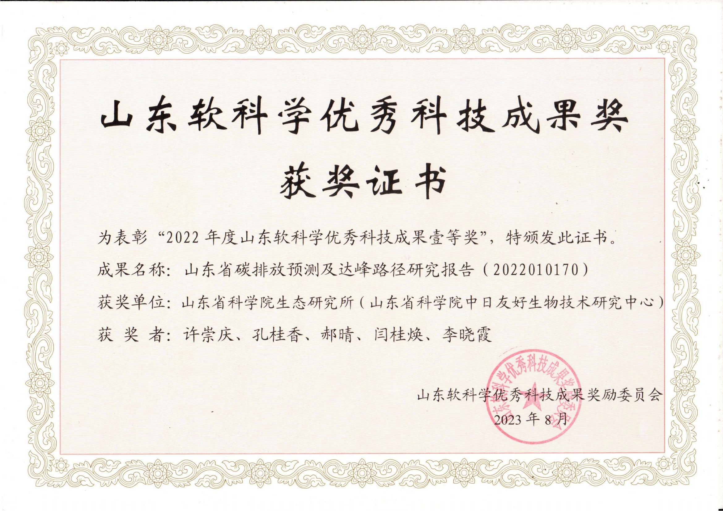 10月27日,2022年度山东软科学优秀科技成果奖颁奖大会在山东泰安举行 香蕉app,环境科学与工程学部生态战略团队完成的“山东省碳排放预测及达峰路径研究报告”荣获2022年度山东软科学优秀科技成果奖一等奖。