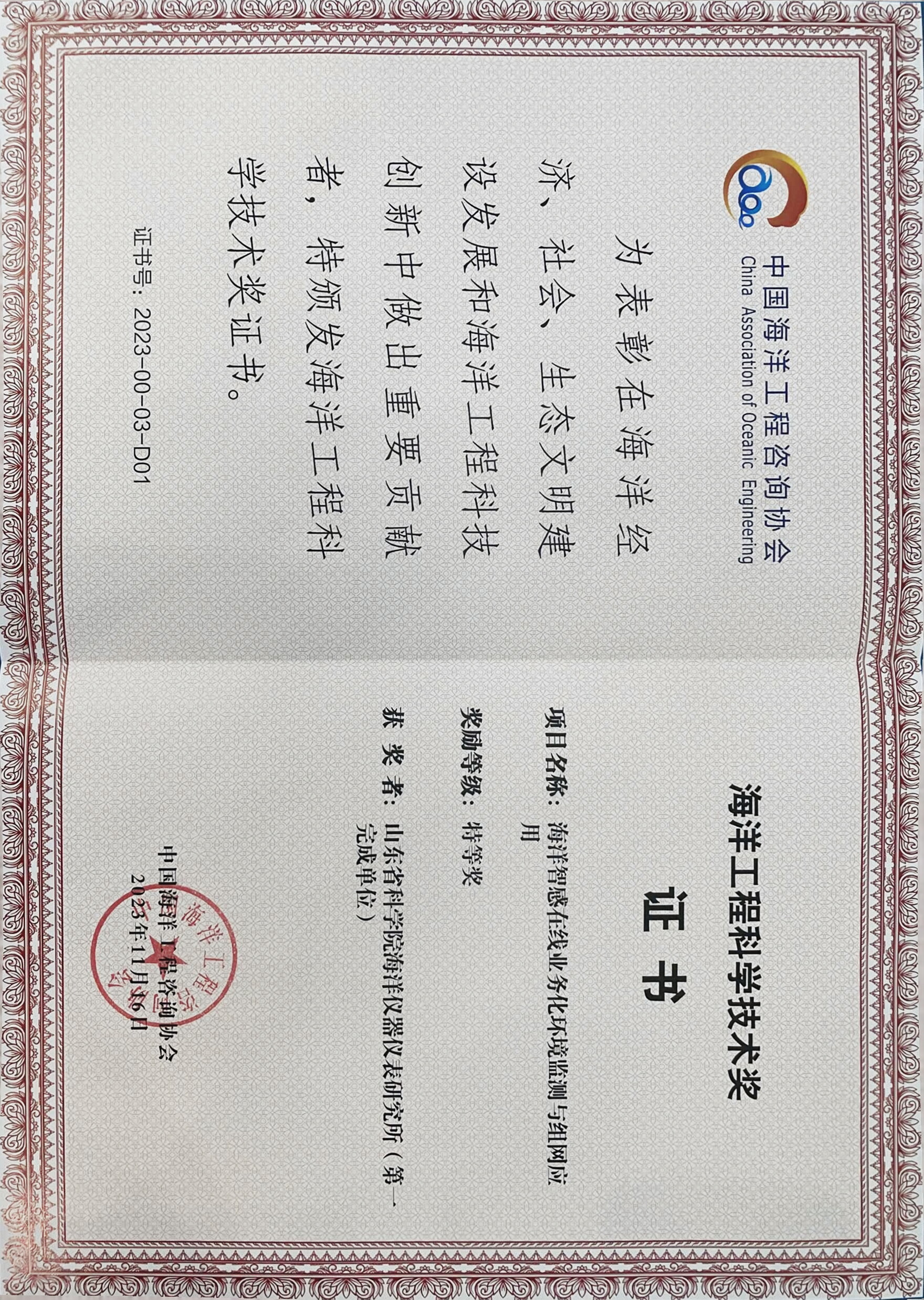 11月23日,2023年度海洋工程科学技术奖颁奖大会暨海洋经济创新发展大会在深圳举行 香蕉app,齐鲁工业大学(山东省科学院)“海洋智感在线业务化环境监测与组网应用”项目荣获海洋工程科学技术奖特等奖。