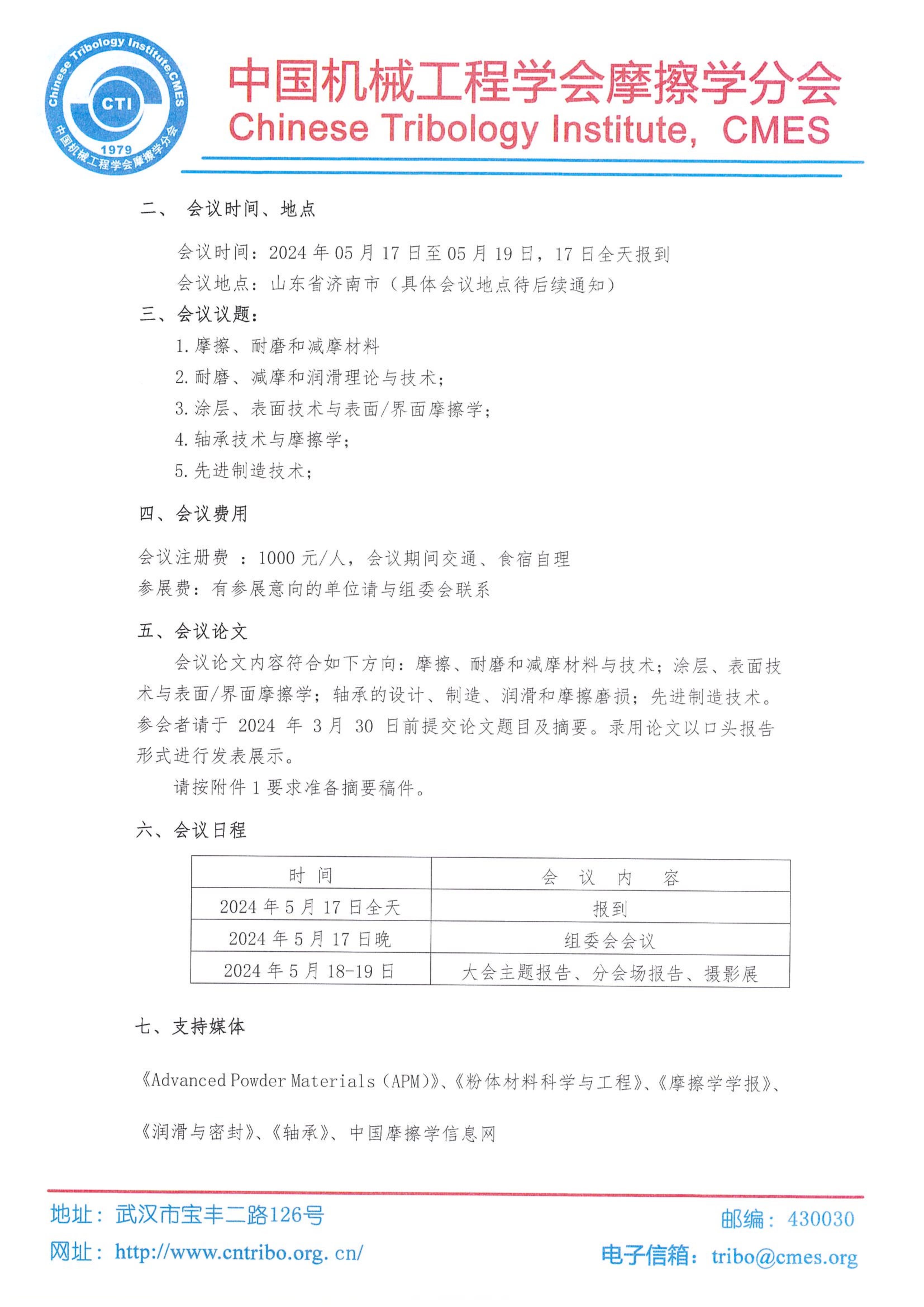 关于召开“2024 年全国摩擦耐磨减摩材料与先进制造技术论坛”学术会议通知(第一轮)