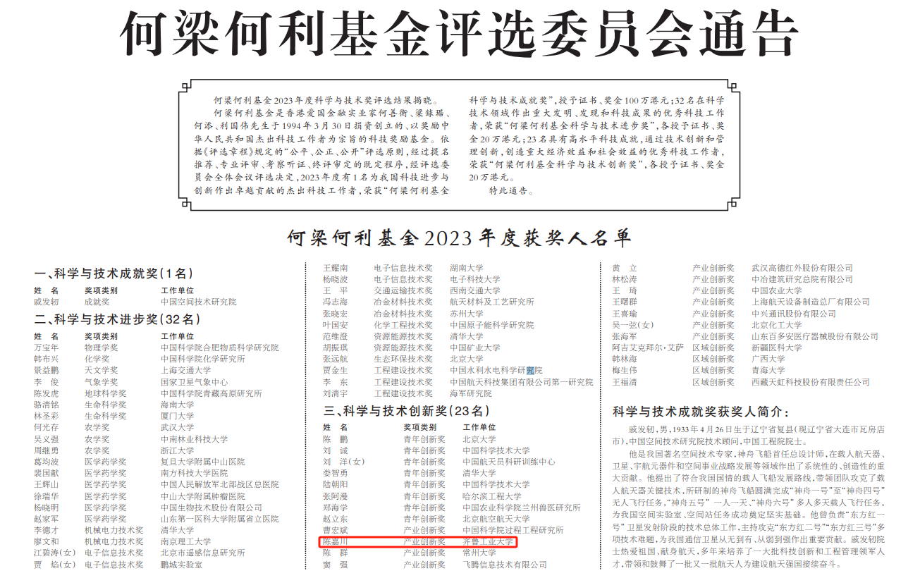 12月19日,何梁何利基金2023年度颁奖大会在北京钓鱼台国宾馆举行 香蕉app,中共中央政治局常委,国务院副总理丁薛祥出席颁奖大会并讲话,齐鲁工业大学(山东省科学院)生物基材料与绿色造纸国家重点实验室主任陈嘉川教授荣获何梁何利基金科学与技术产业创新奖,实现了校(院)该奖项零的突破。