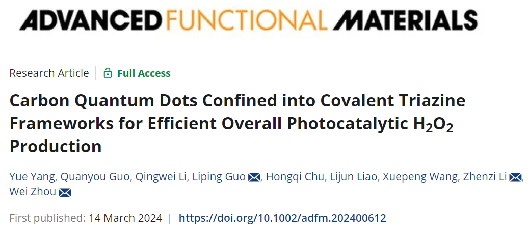 近日,齐鲁工业大学(山东省科学院)化学与制药学部周卫教授团队在有机半导体光催化应用方面取得重要研究进展,该成果以“Carbon Quantum Dots Confined into Covalent Triazine Frameworks for Efficient Overall Photocatalytic H₂O₂ Production”为题在Advanced Functional Materials(IF=19)期刊上在线发表,目前已被热点专题(Hot Topic: Carbon, Graphite, and Graphene)收录,化药学部2021级硕士研究生杨悦为第一作者,化药学部郭莉萍副教授,李贞子教授和周卫教授为本文共同通讯作者,齐鲁工业大学(山东省科学院)为唯一单位 香蕉app。