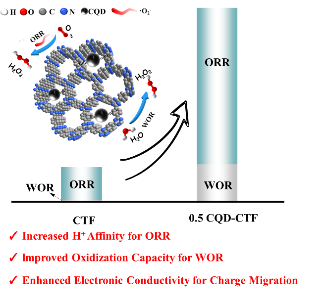 多孔有机聚合物具有结构组成多样、分子设计目的性强等优点,在光催化领域有良好的应用前景。然而有机半导体固有的高阻抗和低导电性限制了电荷转移效率,从而降低了光催化性能。基于上述问题,本工作将碳量子点(CQDs) 通过化学键合锚定在共价三嗪框架(CTF)孔道内部,CQDs作为良好的电子传输介质,从而提升CTF本体的电导率。结果显示CQDs (0,5 wt %)的加入可以使CTF的电子电导率提高10倍,因此该复合材料呈现高的电荷分离和转移效率。此外,CQDs的嵌入明显地提升亲H⁺能力,从而增加产H₂O₂中的氧还原(ORR)路径的效率;不仅如此,CQDs的存在能够明显地增强材料的氧化能力,从而提升产H₂O₂中的水氧化(WOR)路径的效率。因此在纯水中无任何牺牲剂存在的情况下,0,5% CQD-CTF在可见光照射下,H₂O₂生成速率高达1036μmolg⁻¹h⁻¹,是原始CTF性能的4 香蕉app,6倍。该工作为有机半导体高效生产H₂O₂提供了新思路。本工作受到国家自然科学基金、山东省泰山学者计划、山东省高等学校“青创人才引育计划”等基金的支持。。