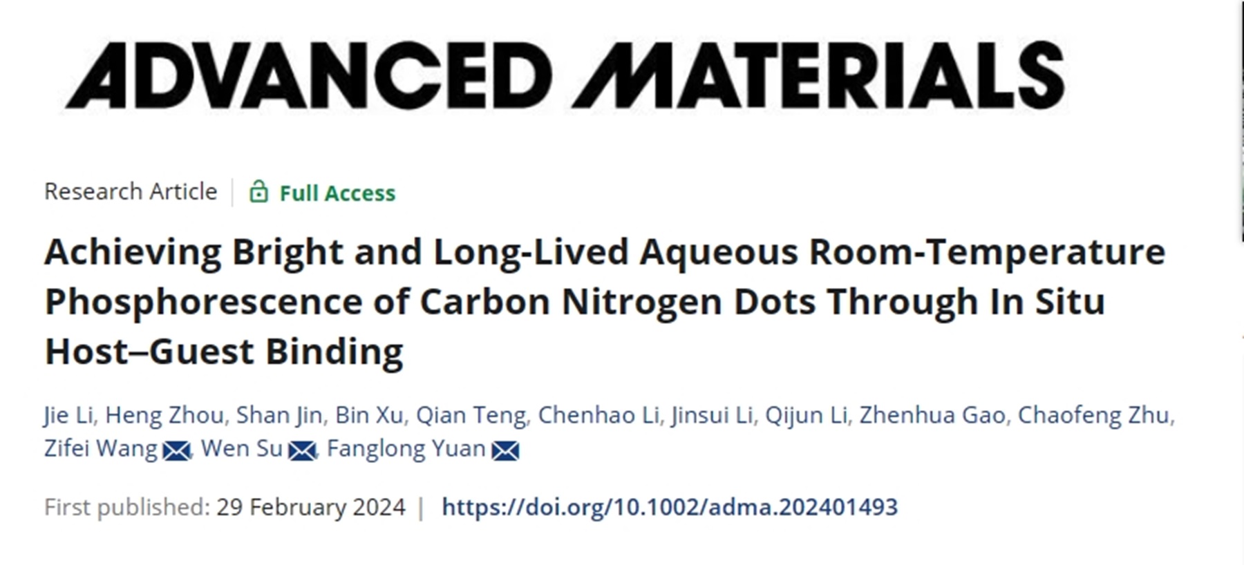 近日,齐鲁工业大学(山东省科学院)材料科学与工程学部微纳光电功能材料创新团队在材料领域国际顶级期刊Advanced Materials (IF=29 香蕉app,4)上在线发表了题为“Achieving Bright and Long-Lived Aqueous Room-Temperature Phosphorescence of Carbon Nitrogen Dots Through In-Situ Host-Guest Binding”的研究论文。材料学部2021级硕士研究生李杰为第一作者,材料学部王子飞副教授、北京师范大学袁方龙教授和国家纳米科学中心宿雯博士为共同通讯作者,齐鲁工业大学(山东省科学院)为第一通讯单位。。