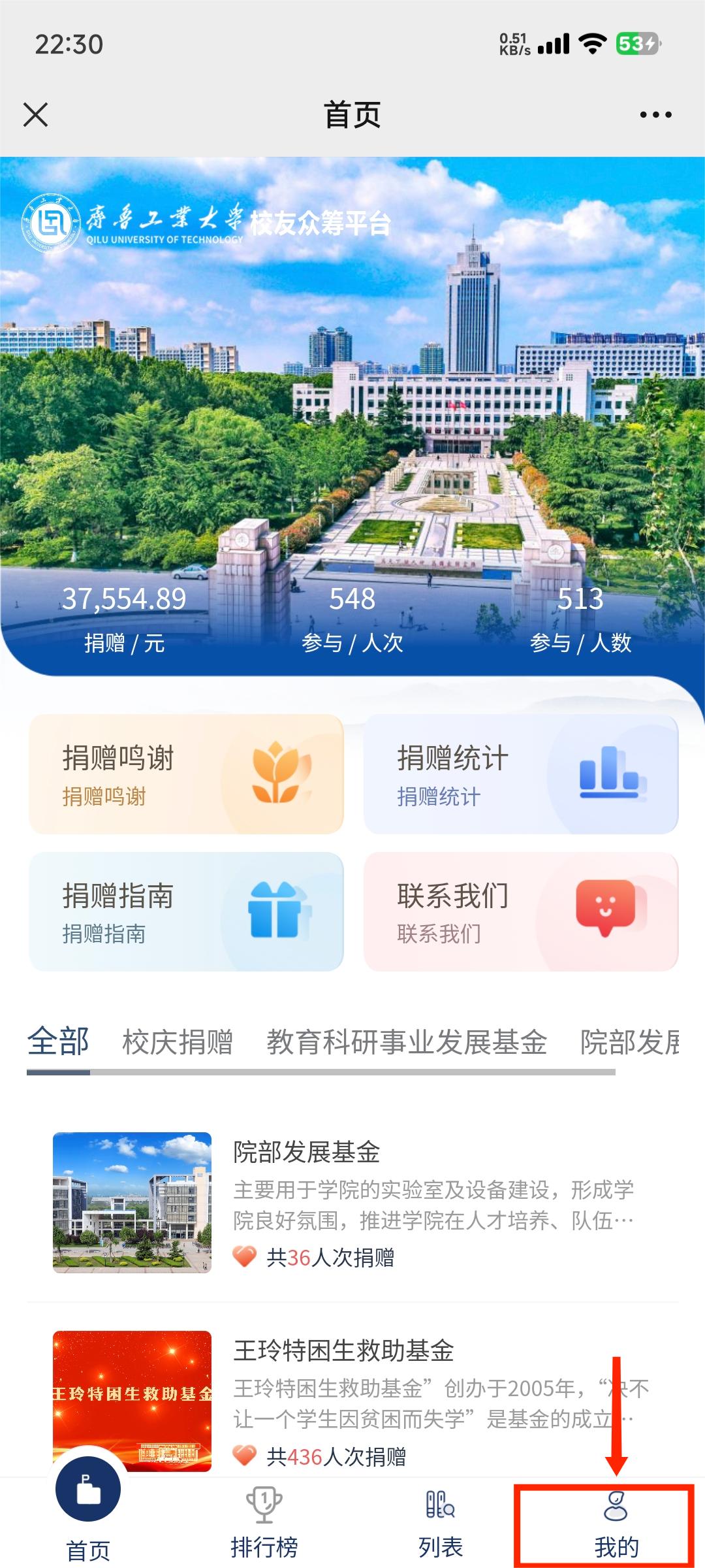 2 香蕉app,点击齐鲁工业大学校友众筹平台右下角“我的”,进入个人界面。。