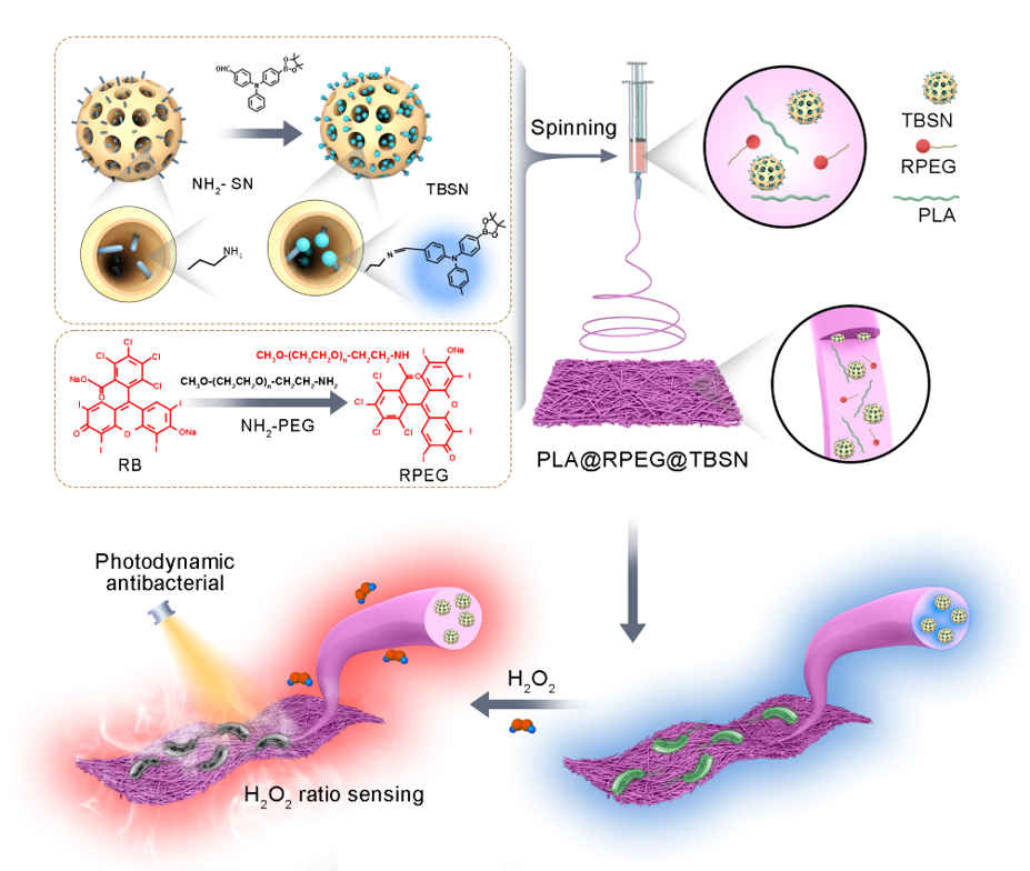 团队利用具有聚集诱导发光(AIE)性能的介孔二氧化硅荧光纳米探针(TBSN)结合孟加拉玫瑰红修饰的聚乙二醇(RPEG)通过静电纺丝技术,制备出具有H2O2传感以及光动力抗菌性能的聚乳酸/聚乙二醇/二氧化硅纳米粒子杂化膜(PLA@RPEG@TBSN),基于比率的荧光变化,柔性PLA@RPEG@TBSN传感器实现了对H2O2蒸汽的高精度,高灵敏度以及实时可视化的检测(图1),其检测限低至7 ppb,此外由于含光敏剂聚合物的掺入,PLA@RPEG@TBSN表现出优异的光动力抗菌活性,用于口罩上可以在保持有效气体H2O2传感的同时,充分拦截和杀死空气中传播的细菌气溶胶,实现抗菌-传感一体化作用(图2) 香蕉app,这一设计策略在开发高效稳定的智能气体传感器和可穿戴设备,特别是与气体传感和健康保护相关的应用中具有巨大的前景。
