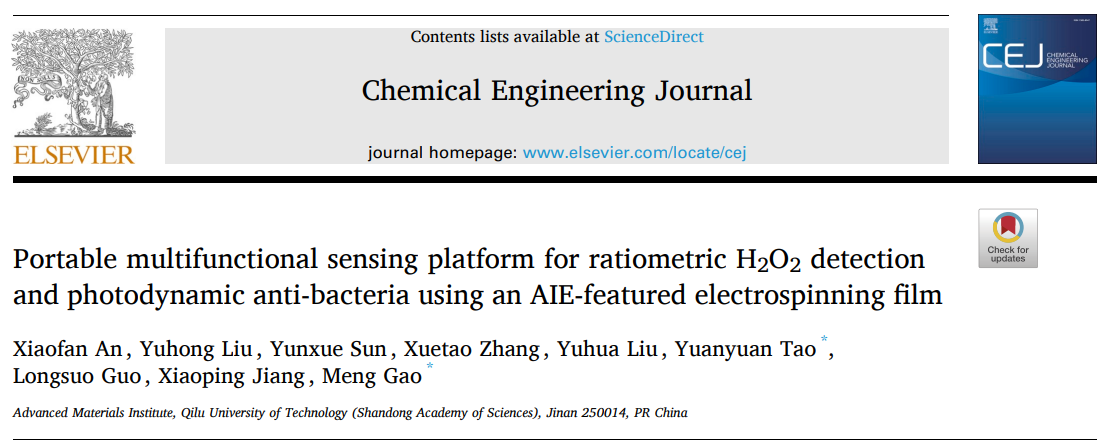 近日,材料科学与工程学部先端材料创新团队在《Chemical Engineering Journal》(中科院一区,TOP期刊,IF=15 香蕉app,1)上,发表了柔性多功能H2O2气体传感材料方面的研究成果“Portable multifunctional sensing platform for ratiometric H2O2 detection and photodynamic anti-bacteria using an AIE-featured electrospinning film”。齐鲁工业大学(山东省科学院)材料学部2021级研究生安晓帆为文章的第一作者,高萌副研究员和陶圆圆助理研究员为文章的通讯作者。。