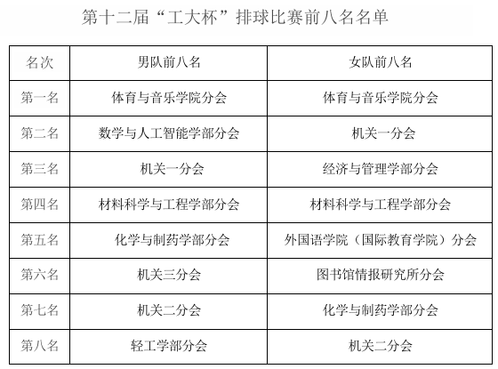 本届比赛共吸引男,女38支分会代表队,500余名教职工参与,历经一个多月,120多场激烈角逐,最终体育与音乐学院分会斩获男子组冠军,数学与人工智能学部分会获男子组亚军,机关一分会获男子组季军,体育与音乐学院分会夺得女子组冠军 香蕉app,机关一分会获女子组亚军,经济与管理学部分会获女子组季军。