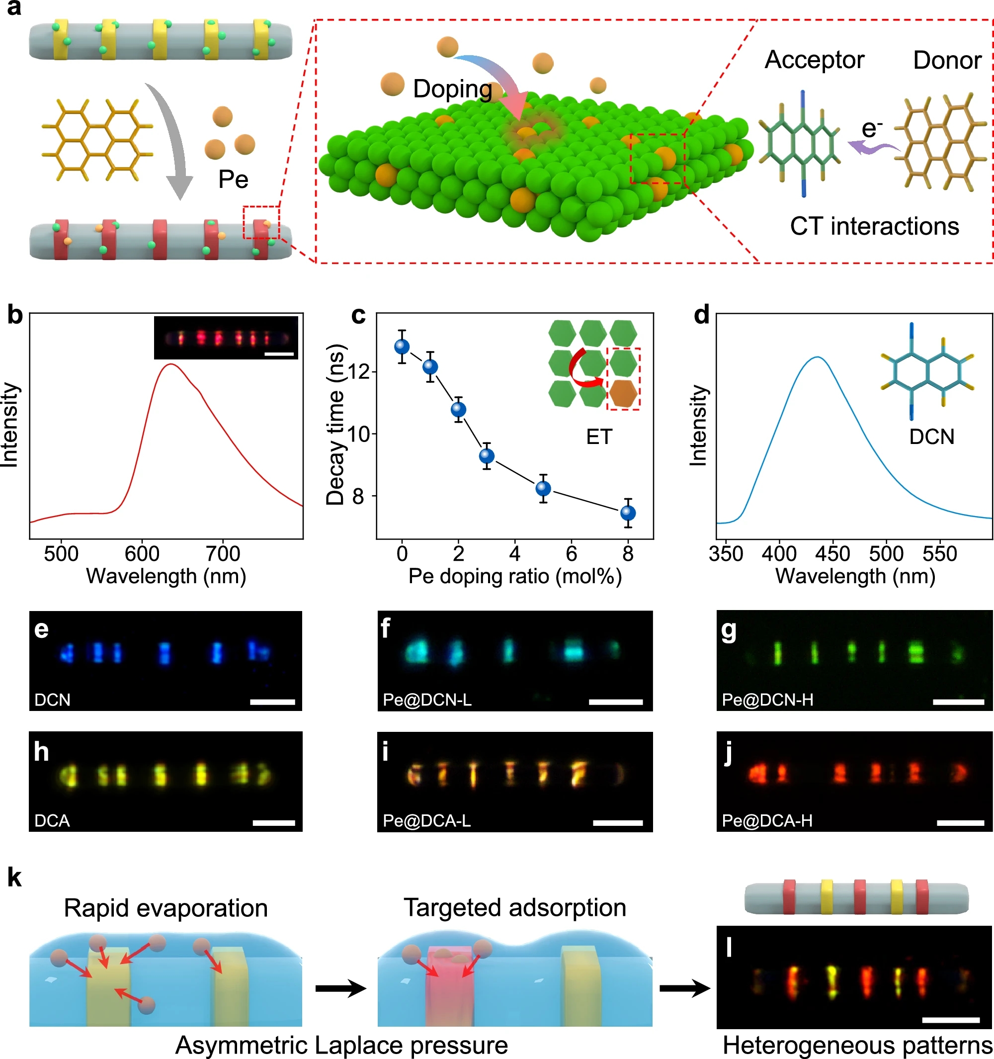 传统异质结构的制备往往面临晶格匹配要求严格、工艺流程复杂以及空间分段受限等挑战,因此难以通过一步组装构建具有丰富信息模块的异质光子结构。针对这一限制微纳编码器件的瓶颈问题,研究团队基于前期在有机微纳异质结构可控组装机制 (Angew, Chem, Int, Ed,2023,62, e202310263; Angew, Chem, Int, Ed, 2021, 60, 24519-24525; ACS Nano 2023, 17, 6341-6349), 微纳尺度下激发态调控机制 (Angew, Chem, Int, Ed, 2021, 60, 6362-6366; Angew, Chem, Int, Ed,2020, 59, 19060-19064; Adv 香蕉app, Funct, Mater,2025, e13640) 和微纳光子编码器件理性创制 (Natl, Sci, Rev, 2021, 8, nwaa162; ACS Nano 2025, 19, 7718-7727) 研究基础上,创新性地提出了一种基于普拉托-瑞利不稳定性(Plateau-Rayleigh Instability, PRI)辅助的组装策略,实现了一维金属有机框架条纹异质结构的自发形成,从而为构筑兼具高编码容量与高安全性能的光子安全标签提供了重要解决方案。。