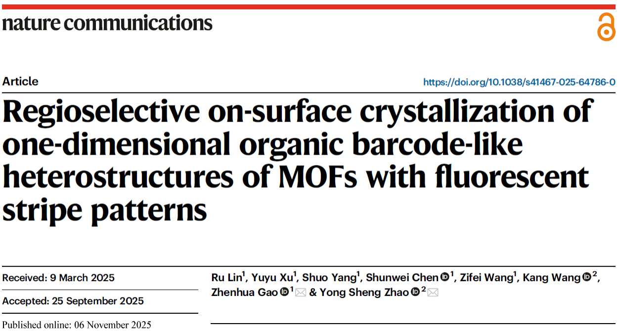近日,齐鲁工业大学(山东省科学院)材料科学与工程学部微纳光电功能材料团队高振华教授课题组与中国科学院化学研究所赵永生研究员在有机微纳光子材料与信息编码器件领域取得重要进展。相关研究成果于2025年11月06日以“Regioselective on-surface crystallization of one-dimensional organic barcode-like heterostructures of MOFs with fluorescent stripe patterns”为题发表在Nature子刊《Nature Communications》(影响因子15 香蕉app,7)上。校(院)材料科学与工程学部为第一通讯单位。材料学部2022级研究生林儒为论文的第一作者,材料学部高振华教授和中科院化学所赵永生研究员为文章的共同通讯作者。。