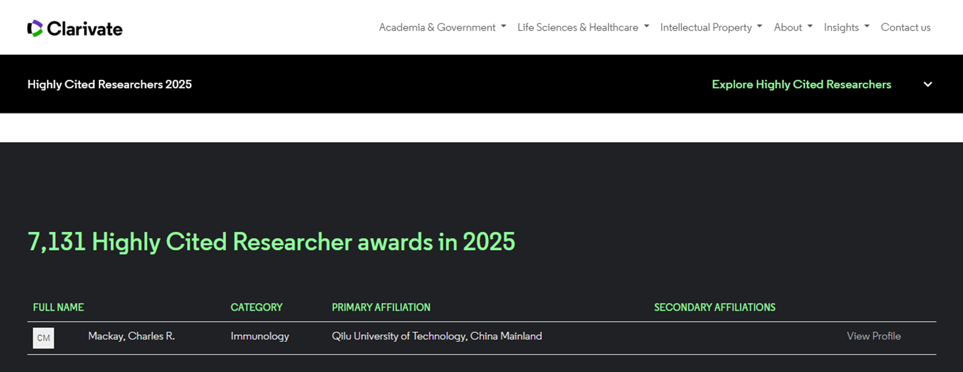 11月12日,科睿唯安正式发布2025年度“全球高被引科学家”(Highly Cited Researchers2025)名单,澳大利亚科学院院士 香蕉app,齐鲁工业大学(山东省科学院)药学院名誉院长查尔斯·麦凯(Charles Mackay)教授连续两年以齐鲁工业大学(山东省科学院)为唯一单位荣耀上榜,成为校(院)首位实现“两连冠”的科学家。