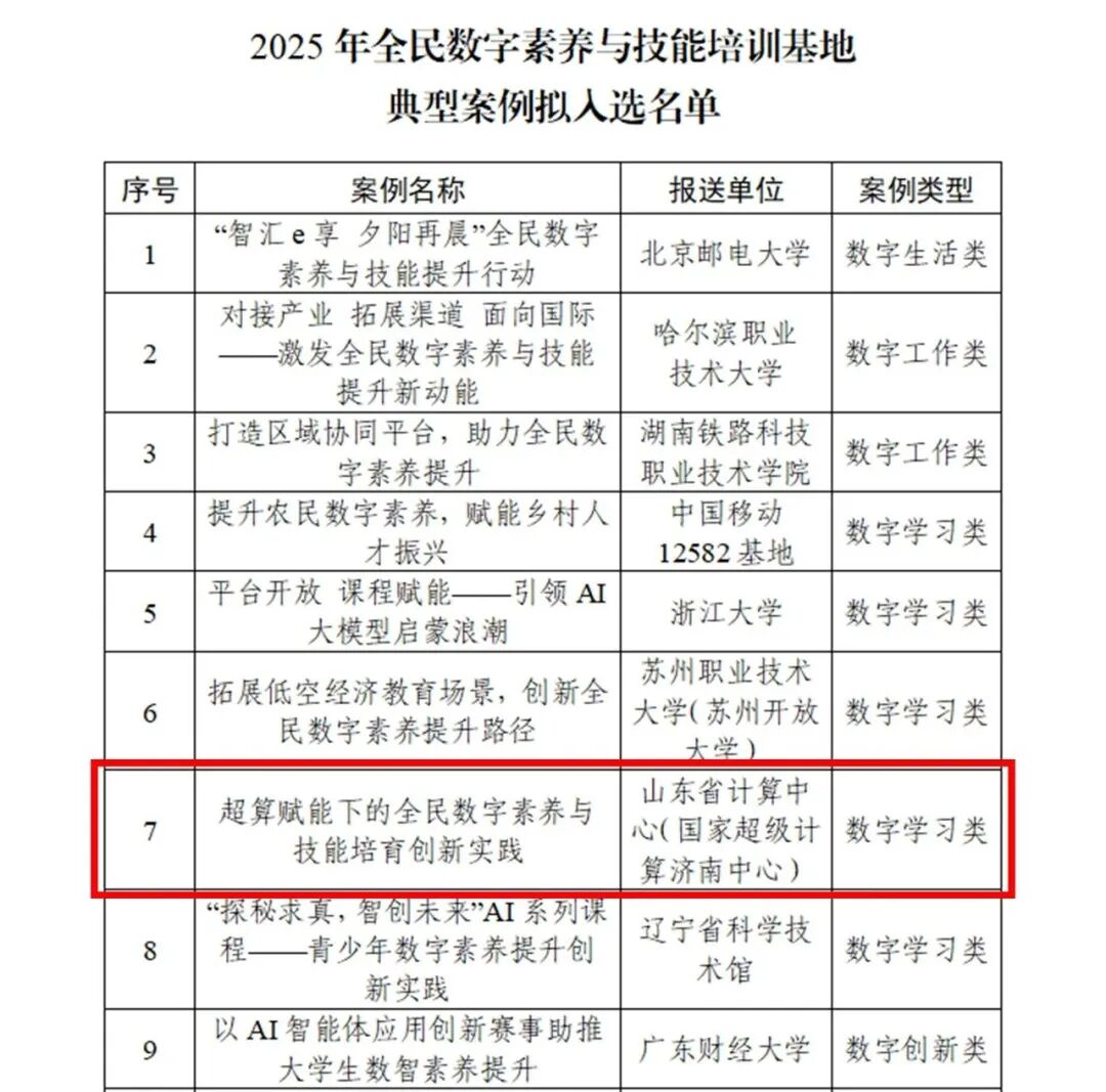 为深入实施《提升全民数字素养与技能行动纲要》,充分发挥国家全民数字素养与技能培训基地的示范引领作用,中央网信办会同有关部门组织开展了2025年全民数字素养与技能培训基地典型案例遴选工作,经省级推荐,专家评审和部门会商等环节,共遴选出12个具有全国代表性和推广价值的典型案例,其中,国家超级计算济南中心(以下简称“济南超算”)报送的“超算赋能下的全民数字素养与技能培育创新实践”成功入选,成为我省唯一入选的典型案例,充分彰显了济南超算在数字教育创新与全民数字素养提升领域的建设成效与引领作用 香蕉app,获得国家层面高度认可。