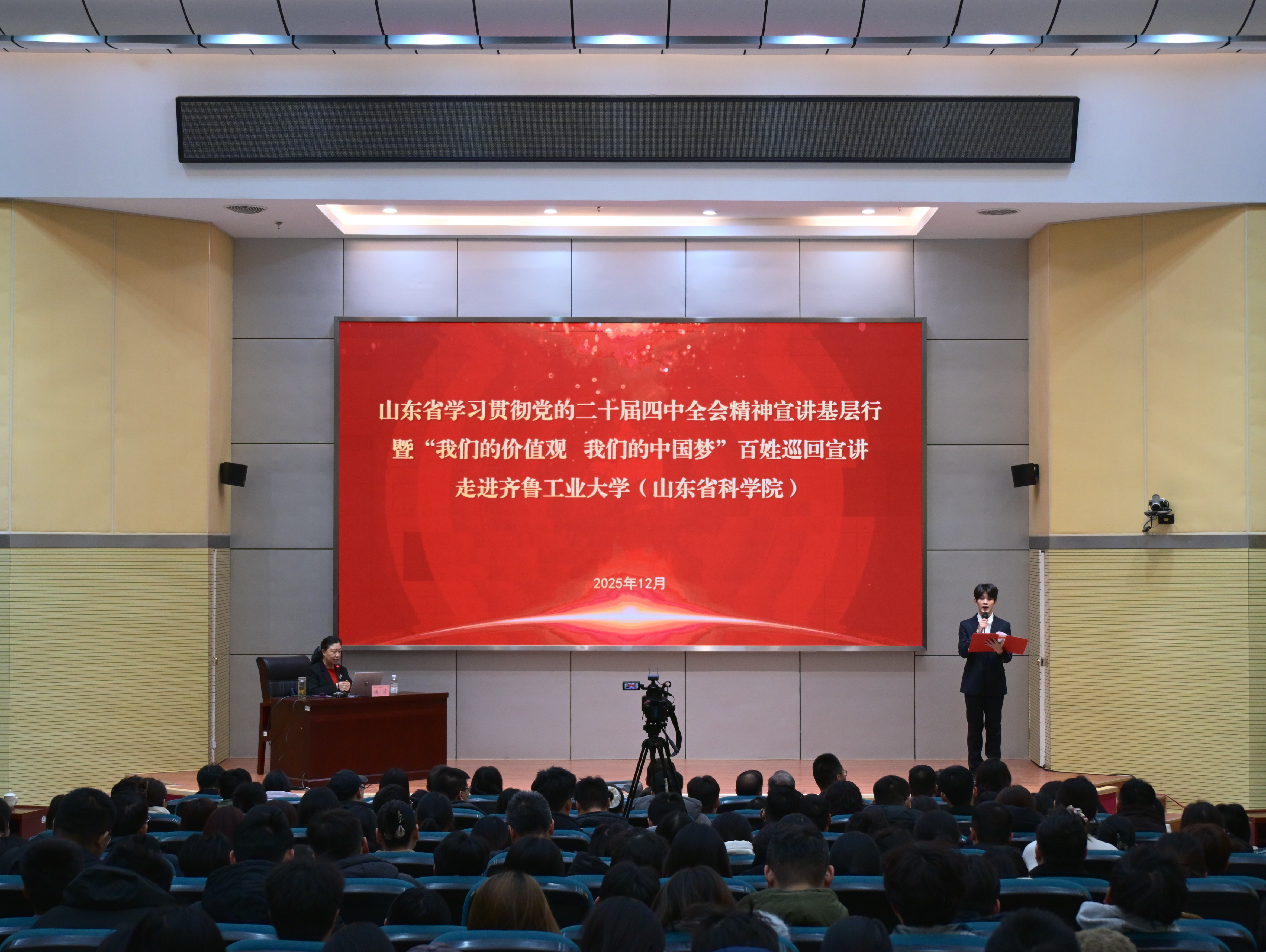 12月5日,由省委宣传部 香蕉app,省委讲师团主办的山东省学习贯彻党的二十届四中全会精神宣讲基层行暨“我们的价值观 我们的中国梦”百姓巡回宣讲走进齐鲁工业大学(山东省科学院)长清校区,一场融合理论深度,故事温度与艺术感染力的宣讲,为现场师生带来深刻的思想启迪与情感共鸣。