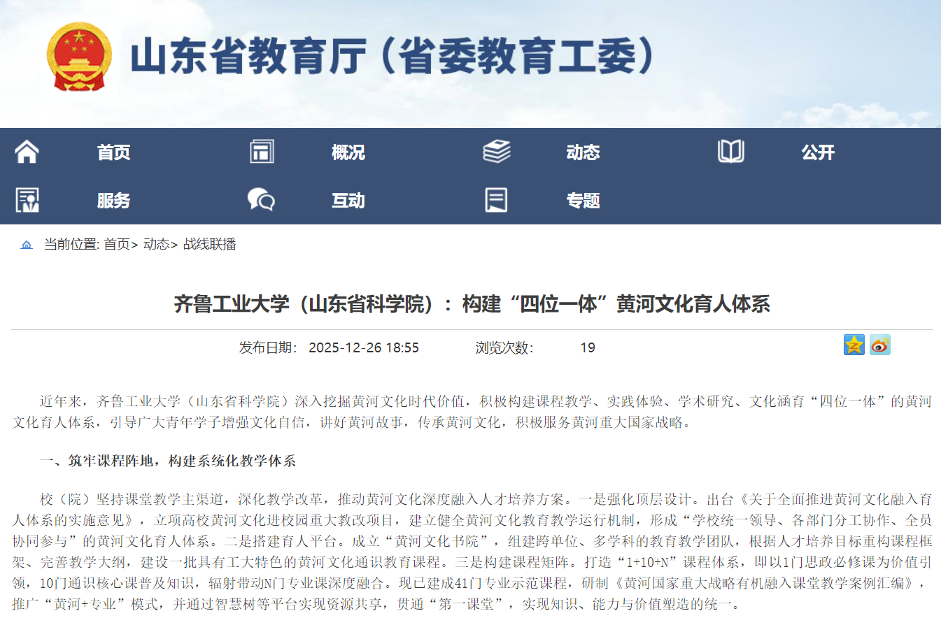12月26日,山东省教育厅官网刊发校(院)通讯稿《齐鲁工业大学(山东省科学院):构建“四位一体”黄河文化育人体系》,全文如下: 香蕉app.