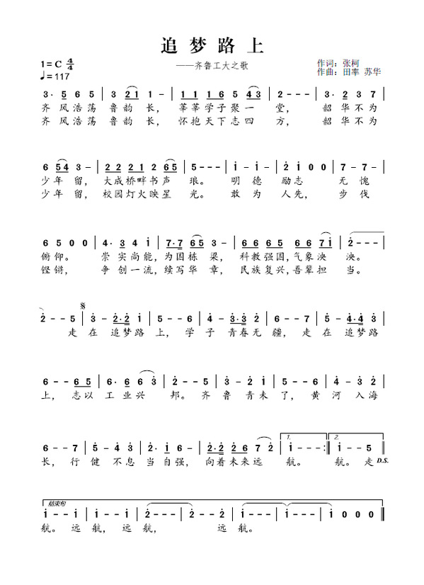校 歌 | 校歌歌词共分上部、下部和副歌三个部分 上部的开头“齐风浩荡鲁韵长”,将“齐鲁工大”中的“齐鲁”二字包孕其中,交代出齐鲁大地厚重的文化底蕴。“莘莘学子聚一堂,韶华不为少年留,大成桥畔书声琅”,将主校区的标志性建筑大成桥,与“莘莘学子”“韶华”“少年”这些富有青春气息的词句融为一体,突出了主校区地理位置。“韶华不为少年留”一句,典出宋代著名词人秦观的《江城子·西城杨柳弄春柔》,与上部的“大成桥畔书声琅”和下部的“校园灯火映星光”和谐连接,意在勉励学子珍惜寸阴,刻苦读书。“明德励志”“崇实尚能”“敢为人先”“争创一流”,展现出科教融合后对校(院)精神文化的继承和弘扬。接下来的“无愧俯仰”语出《孟子·尽心上》“仰不愧于天,俯不怍于人”,与下面的“为国栋梁”相呼应,寓意我们培养的是品行高尚的国家栋梁之才。最后的“科教强国,气象泱泱”,体现出在科教强国的时代背景下,校(院)作为科教融合单位快速发展的强劲势头。 下部的“步伐铿锵,续写华章”,寓意全体工大(科院)人意气风发、气势昂扬、精神抖擞地迈向前方,铸就新的辉煌。最后以“民族复兴,吾辈担当”收尾,激励广大师生为实现民族复兴的中国梦贡献力量。 副歌突出追梦主题。“齐鲁青未了”典出杜甫名作《望岳》,寓意齐鲁工大作为山东省高水平大学的地位,与接下来的“黄河入海长”相对应。泰山与黄河既是国家地理符号,又是国家文化符号,二者有机地出现在一首歌曲中,既增加了作品的精神高度,也使学校的地理概念更为突出,进一步彰显了中华文化。“走在追梦路上,志以工业兴邦”,出自学校的校徽说明,即“国无工不强,志以工业兴邦”。“行健不息当自强”源自“天行健,君子以自强不息”,与“向着未来远航”一起寓意着全体工大(科院)人积极作为,发愤图强,向着“国内一流、国际有影响的应用研究型大学”的建设目标而奋勇前行。 ~~~~~~~~~~~~~~~~~~~~~~~~~~~~~~~~~~~~~~~~~~~~~~~~~~~~~~~~~~~~~~~~~~~~~~~~~~~~ |